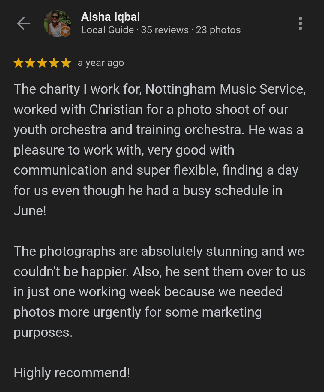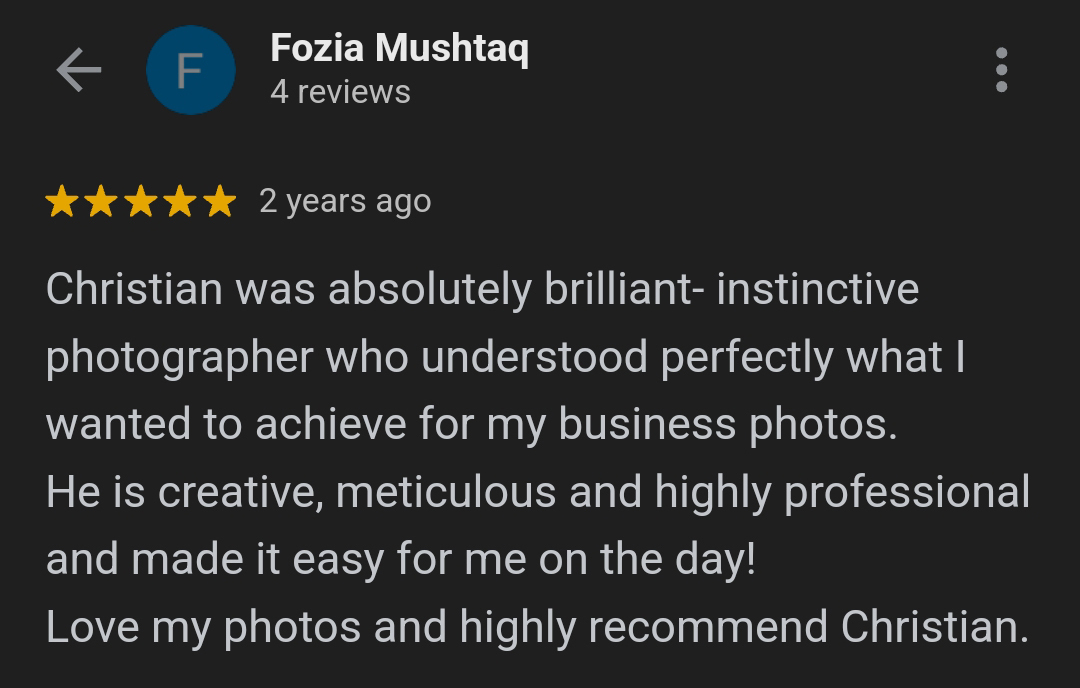 Fozia's review relates to a corporate lifestyle photoshoot for a beauty therapy business in Southwell,