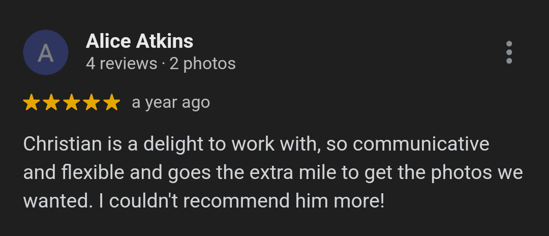 Alice's review refers to a corporate photography shoot whereby a significant environmental